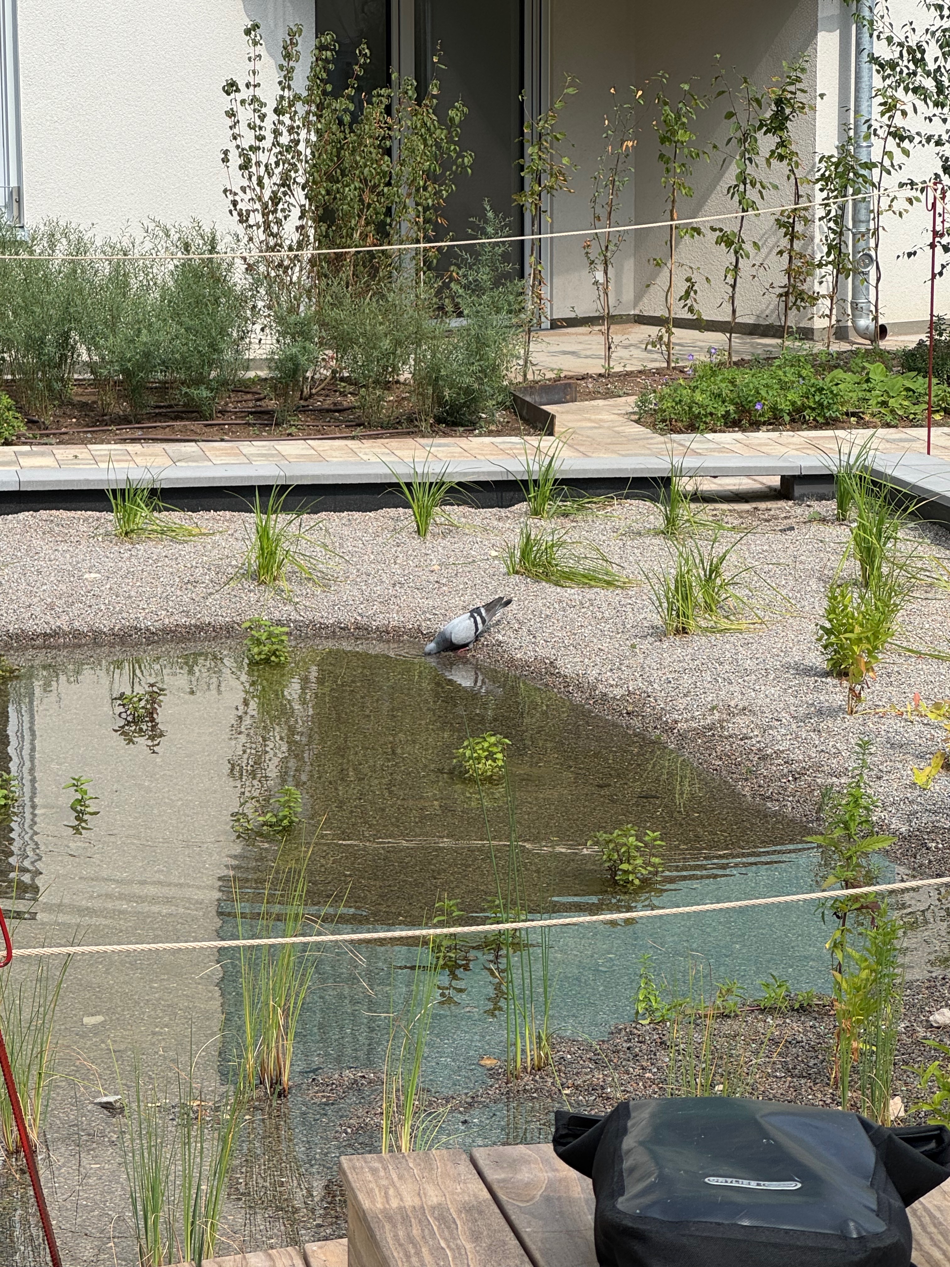 Der Überschuss an aufbereitetem Servicewasser bildet die dauerhafte Wassergrundlage der zentralen Teichanlage im Innenhof. Innerhalb der Anlage wurde ein offenes Bachbett als ökologische und hydraulische Basis ausgebildet, dessen Dimensionierung auf die kontinuierliche Wasserzufuhr abgestimmt ist. Der Bach durchfließt die Teichanlage von oben nach unten und sorgt für eine stetige Wasserbewegung.