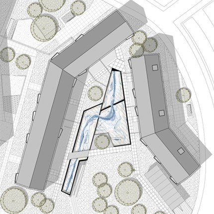 Die umliegenden Gebäude rahmen den Hof und definieren klare Raumkanten. Wege, Grünflächen und Aufenthaltsbereiche sind gezielt auf das Wasser ausgerichtet. Ziel ist es, die Bewohnerinnen und Bewohner bewusst an das Wasser heranzuführen und es als selbstverständlichen Bestandteil des Alltags im Quartier zu verankern.