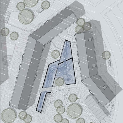 Die Wasserfläche im Innenhof bildet das räumliche und funktionale Zentrum der Anlage. Sie ist Bestandteil der technischen Wasserkreisläufe und gleichzeitig prägendes Element der Freiraumgestaltung. Als dauerhaft wasserführendes Element strukturiert sie den Außenraum, schafft Orientierung und verleiht dem Quartier eine klare Mitte.